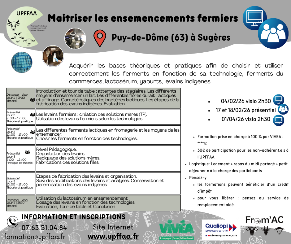 "Maîtriser les ensemencements fermiers" : acquérir les bases théoriques et pratiques afin de choisir et utiliser correctement ses ferments : ferments du commerce, lactosérum, yaourts, levains indigènes - 2*2h30 en visio + 2 jours en présentiel - Formatrice : Aurélie Ménadier - 4 février 2026 en visio, 17 et 18 février en présentiel à la Ferme de la Terrasse à Courpière (63 Puy-de-Dôme), 1er avril en visio